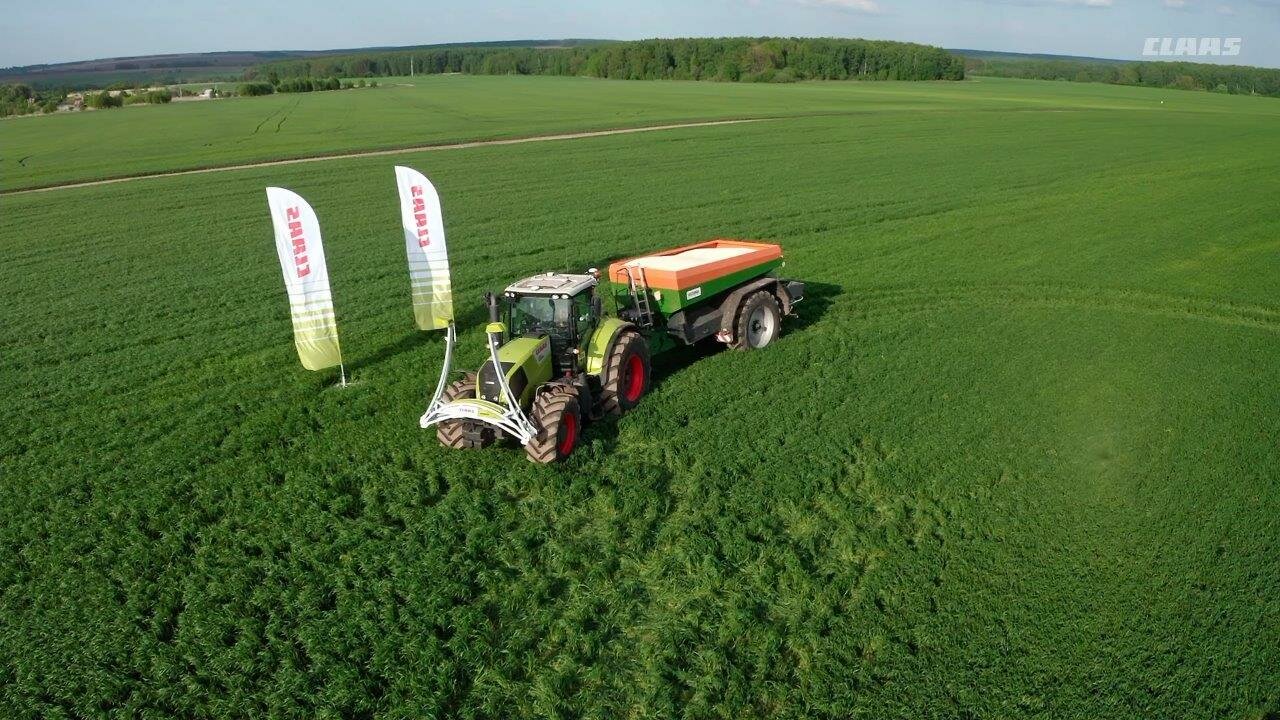 Эксперимент проводился при возделывании озимой пшеницы. Планировалось выяснить, насколько дифференцированное внесение аммиачной селитры при второй подкормке повлияет, во-первых, на расход удобрений, а во-вторых, на урожайность. Работы выполнялись трактором CLAAS AXION 850, агрегатированным с распределителем удобрений AMAZONE ZG-TS 01.